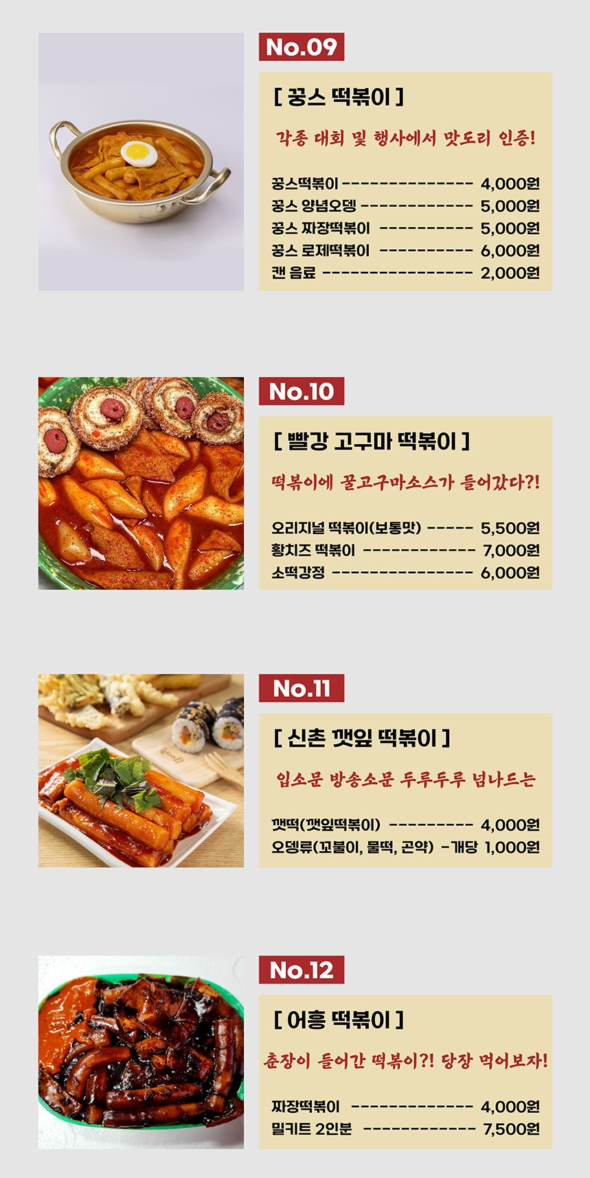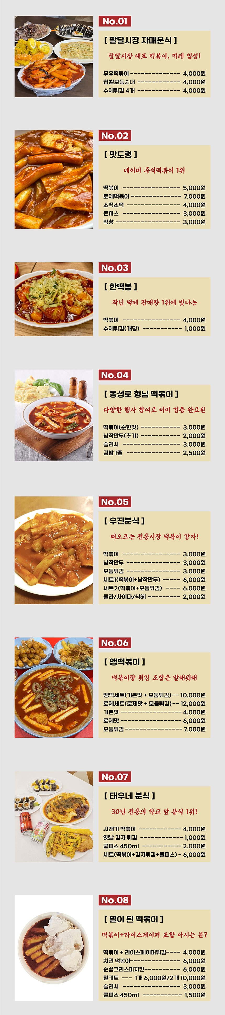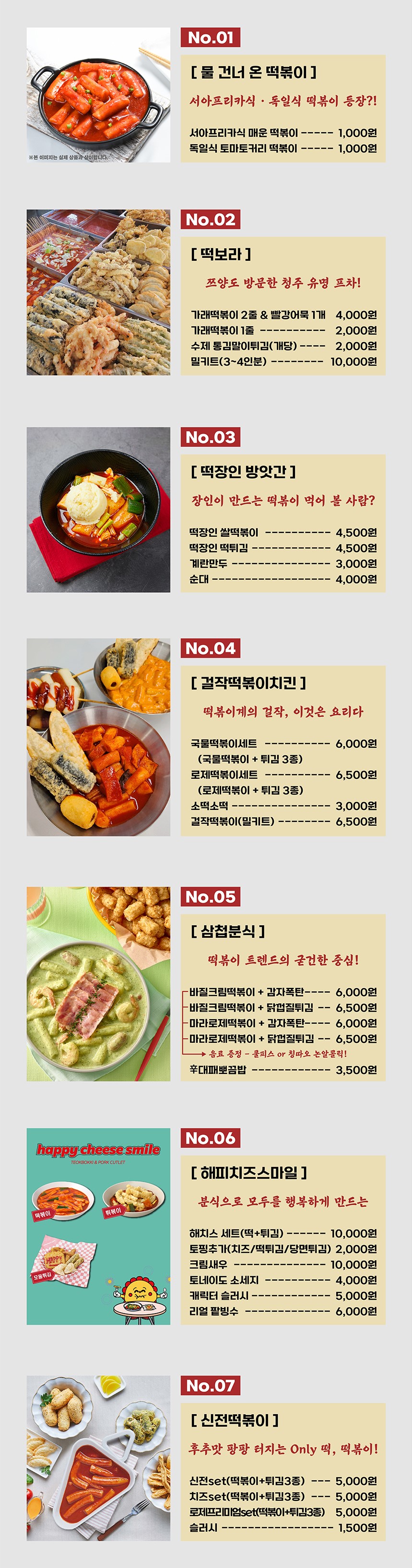- 프랜차이즈 떡볶이 존 : 물 건너 온 떡볶이, 떡보라, 떡장인 방앗간, 걸작떡볶이치킨, 삼첩분식, 해피치즈스마일, 신전떡볶이